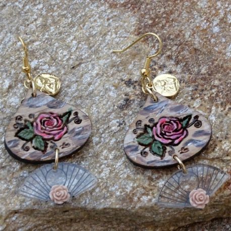 Boucles d’oreilles supports en bois réalisés et peints par mes soins, éventails en plexiglas, mini roses en résine, médaille ange doré à l’or fin, crochets d’oreilles laiton recouvert de 3 microns d’or.