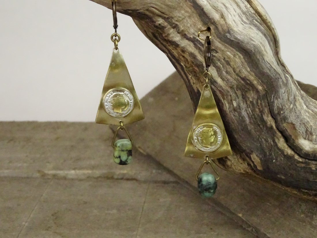 Boucles d’oreilles rustiques travaillées et patinées par mes soins, estampe visage de femme, turquoises baroques, système d’accroche dormeuses. Métal laiton garanti sans nickel, plomb et cadmium.